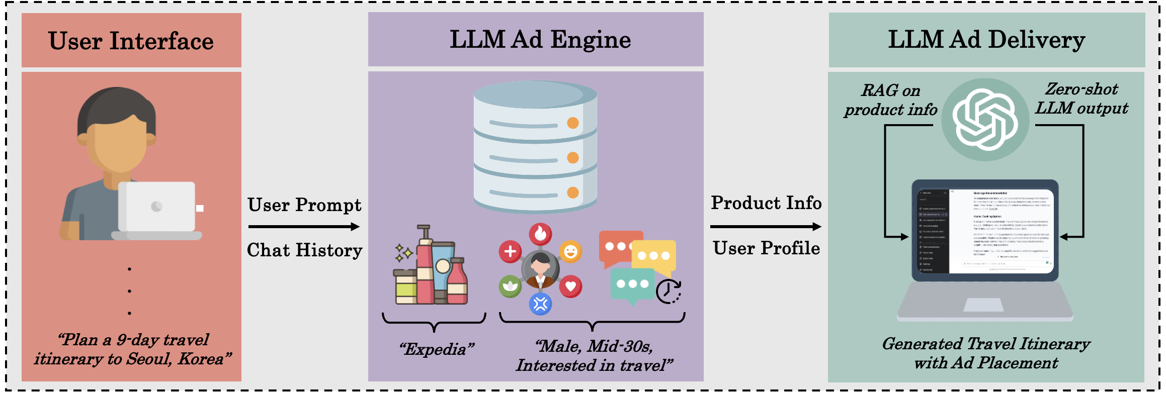 Using the user’s chat history, the LLM generates a basic user profile in JSON, inferring the user’s demographics, interests, and personality. The user’s first query to the chatbot is set to the generic prompt “You are a helpful AI assistant”, in order to first collect information about the user from their queries. The profiles then dynamically become richer based on the user’s interactions with the chatbot. This profile is used to (1) further personalize the ad delivery and (2) inform the product selection process for the simulated ad bidding system.