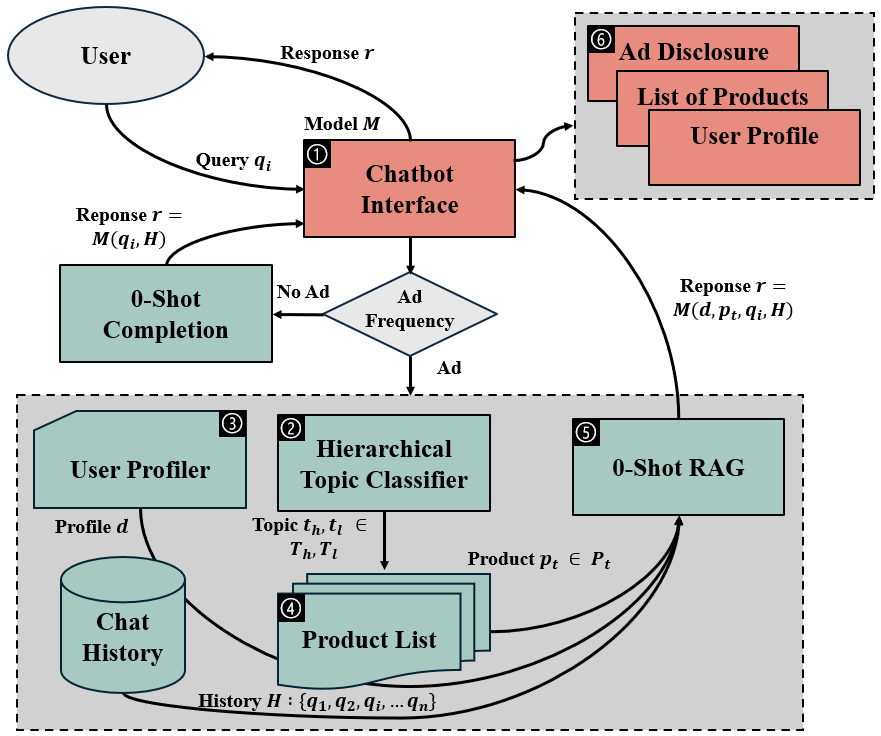 We design our chatbot advertising engine to be similar to what it may look like in the real world. Using an open-source user interface that closely mimics a generic chatbot UI, our goal was to design and implement a realistic chatbot system in which targeted ads are incorpated into chatbot responses, in order to be able to answer our research questions. We focus on text-generated advertisements in the context of information retrieval, suggestion/recommendation, text generation, code generation, and other similar tasks, all leveraging LLMs like ChatGPT.